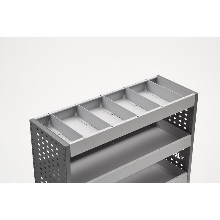 A pack of 5 Powder-coated steel dividers for Rhino MR4 shelves, which can be fitted in multiple positions along each shelf (anywhere you see a hole in the top edge). They can be used with or without the rubber matting for Rhino MR4 shelves (ordered separately) and are easily fitted, just slot in and a clip holds them in position.