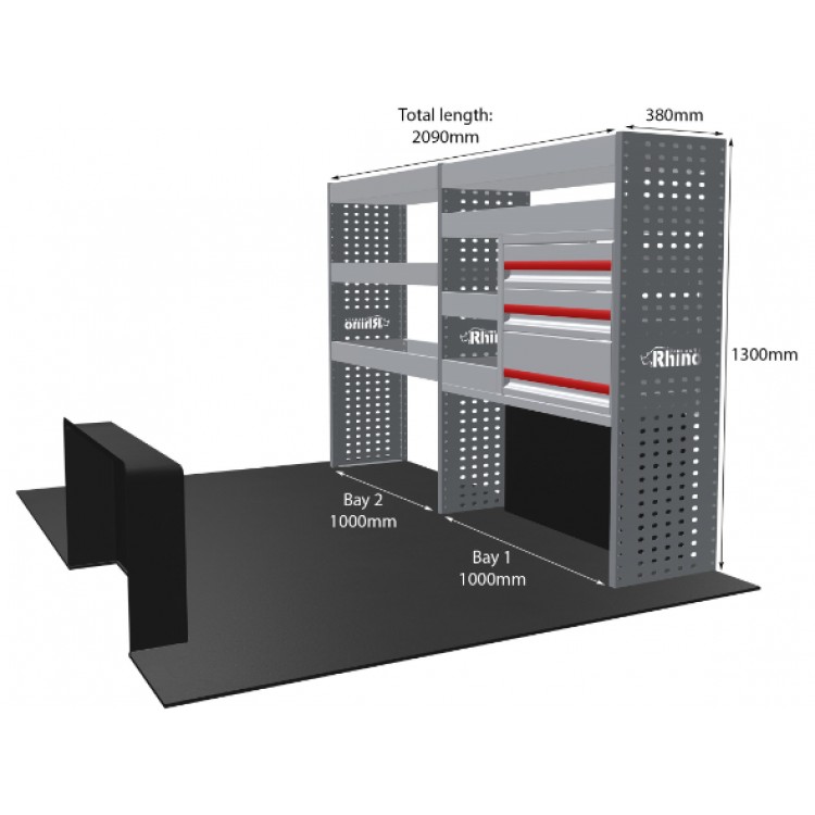 Double Offside (Drivers Side) Racking unit - 2 bay(s), 6 shelves with 600mm wide drawer unit.